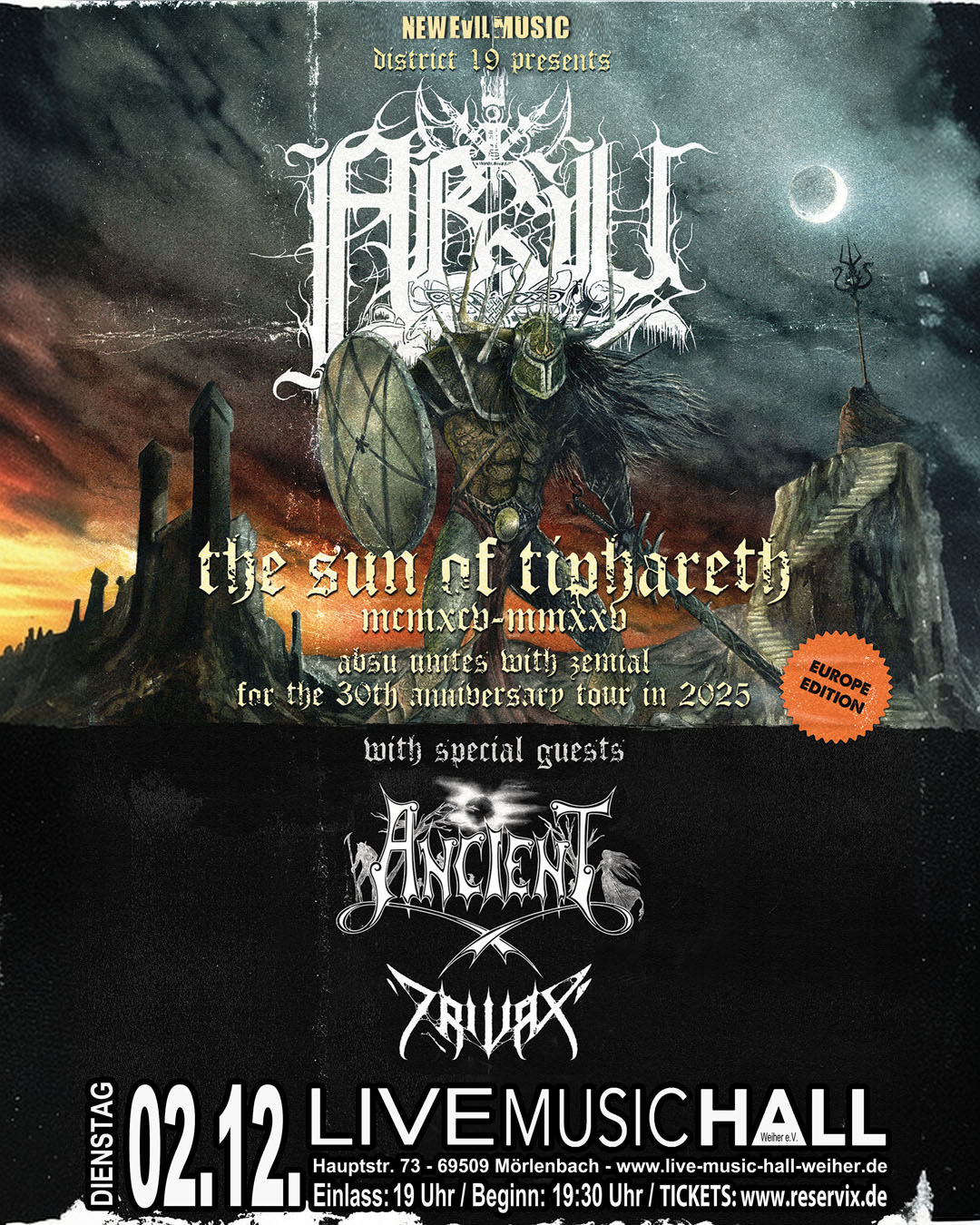 Live Music Hall Weiher Hauptstraße 73, MörlenbachABSUUnites with Zemial for The Sun Of Tiphareth 30th Anniversary tour 2025Direct-Support: AncientSupport: TrivaxDi. 02.12.2025 / Live Music Hall WeiherEinlass 19:00 Uhr / Beginn 19:30 UhrTICKETS newevilmusic.reservix.de/events https://www.youtube.com/watch?v=Jwlb-iQBy4w&list=RDJwlb-iQBy4w&start_radio=1