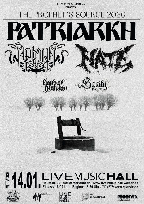 Live Music Hall Weiher Hauptstraße 73, MörlenbachPatriarkhThe Prophet's Source - Tour 2026Special Guests: Arkona & HateSupports: Halls Of Oblivion & SanityMi. 14.01.2026 / Live Music Hall WeiherEinlass 18:00 Uhr / Beginn 18.30 UhrTICKETS www.reservix.de https://www.youtube.com/watch?v=79T3DUgYCMY&list=RD79T3DUgYCMY&start_radio=1